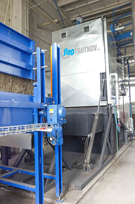 Kotelna o výkonu 800 kW na spalování celých hranatých balíků sena pro vytápění kanceláří a dalších objektů.