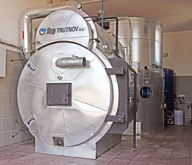 This 190kW boiler firing round bales of straw serves for heating of the farm.